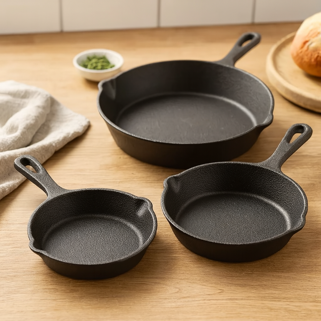 Alvaris | 3-teiliges, vorgewürztes Gusseisen-Bratpfannenset