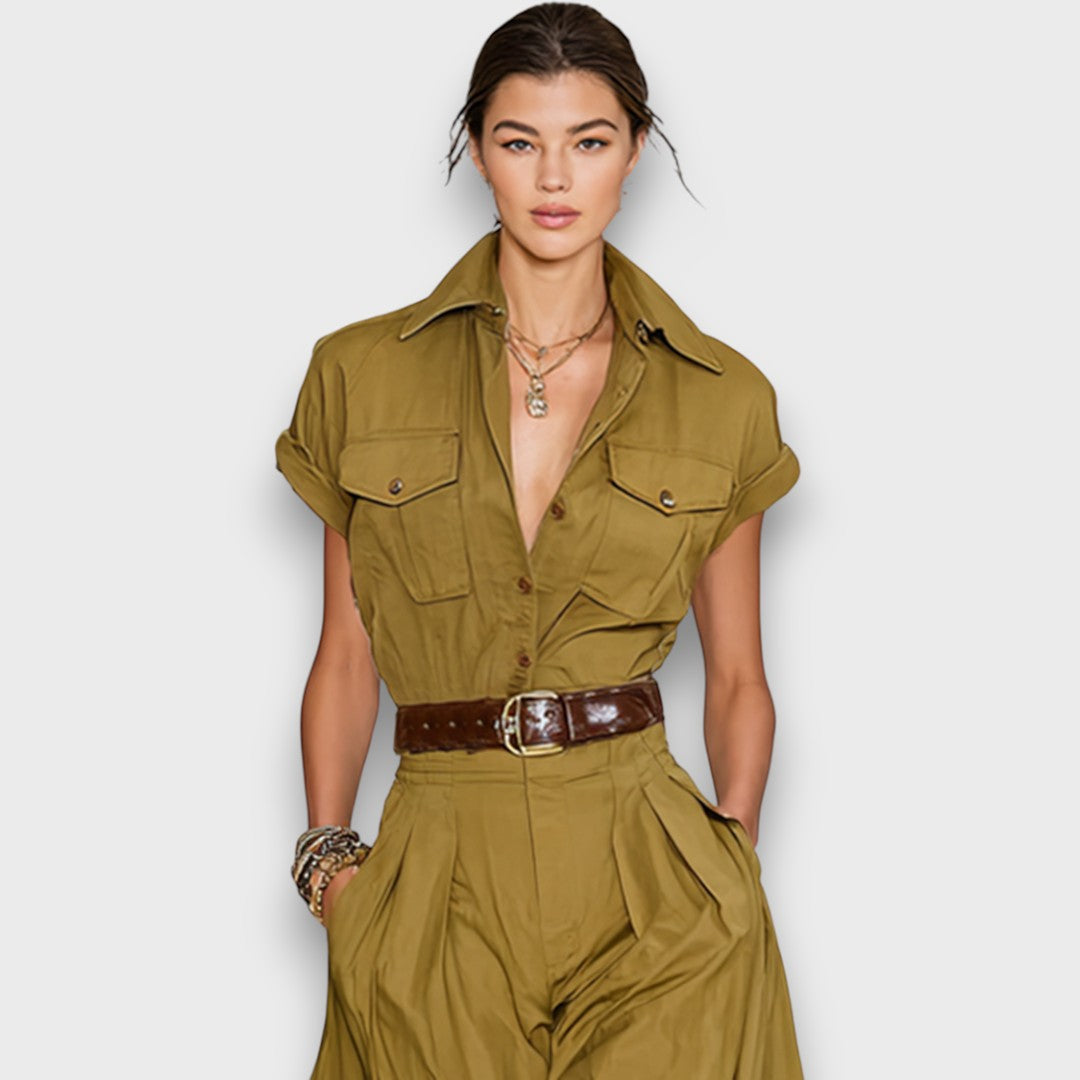 Ein Kleid, das lässige Natürlichkeit und raffinierte Eleganz miteinander verbindet. Das Hemd-Design mit klassischem Kragen und kurzen Ärmeln sorgt für eine zeitlose Silhouette, während der fließende Rock dem Look eine feminine Note verleiht. Ein Gürtel betont die Taille und setzt dezente Akzente, die das Kleid wandelbar für Alltag wie besondere Anlässe machen.