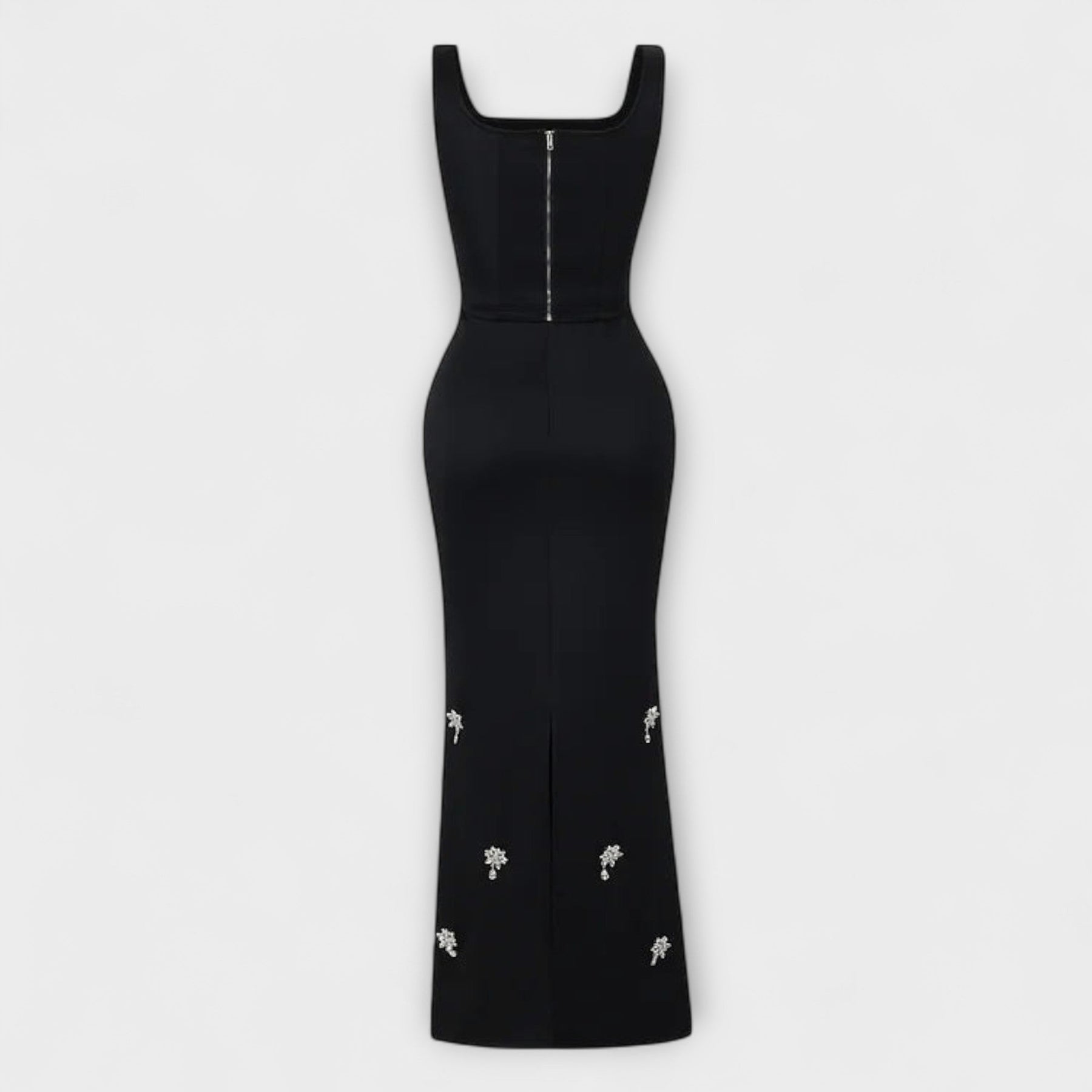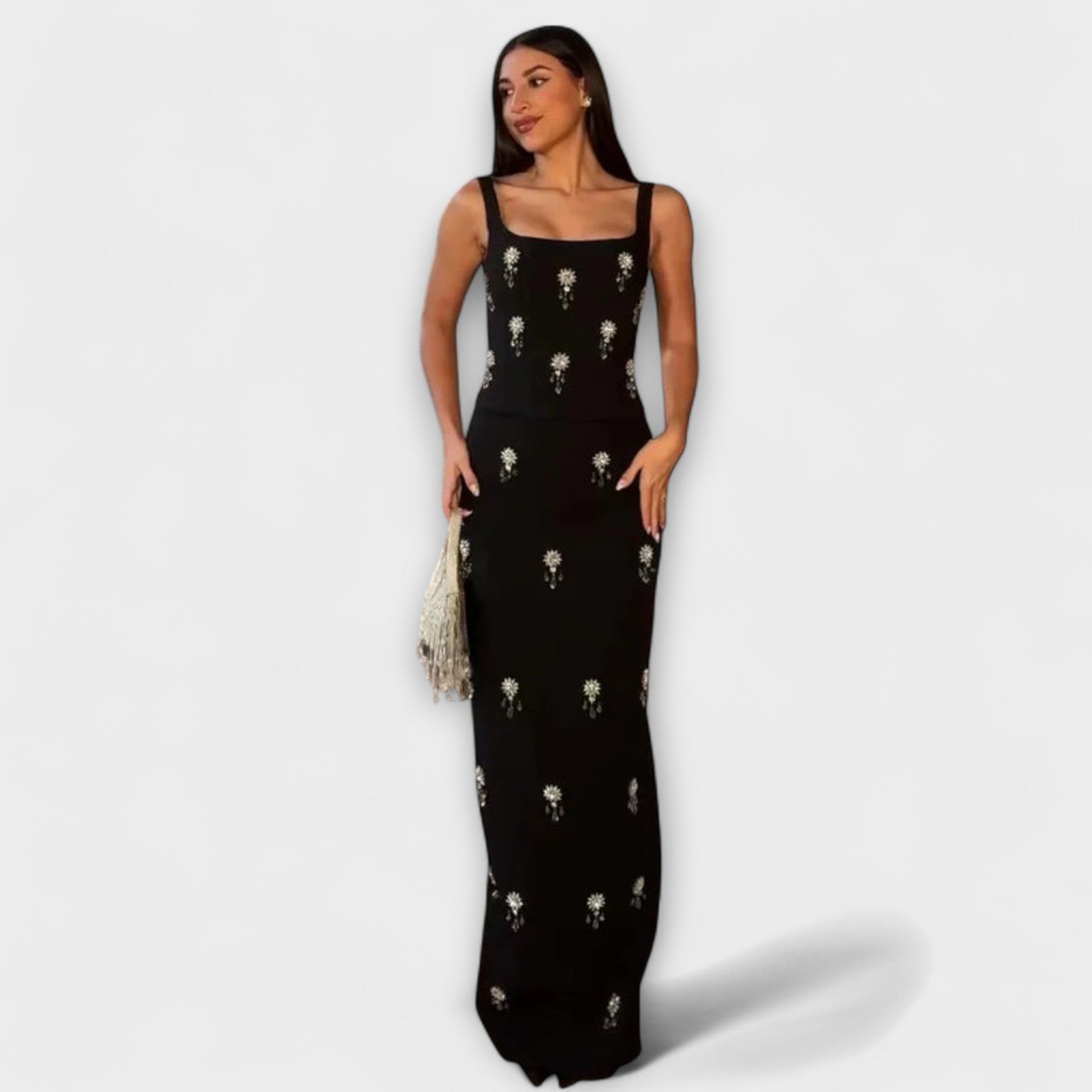 Aviane – Schwarzes Ensemble mit Perlen-Zipper-Top und Rock