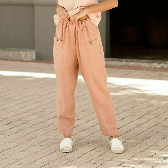 Wir stellen vor: Unsere Bersha Sommerhosen - luftige Sommerhosen für Frauen mit einem elastischen Bund. Diese Hosen sind so konzipiert, dass sie während der wärmsten Tage des Sommers Komfort und Atmungsaktivität bieten, wobei ihr leichtes Gewebe und der dehnbare Bund eine perfekte Passform für den ganztägigen Gebrauch gewährleisten.