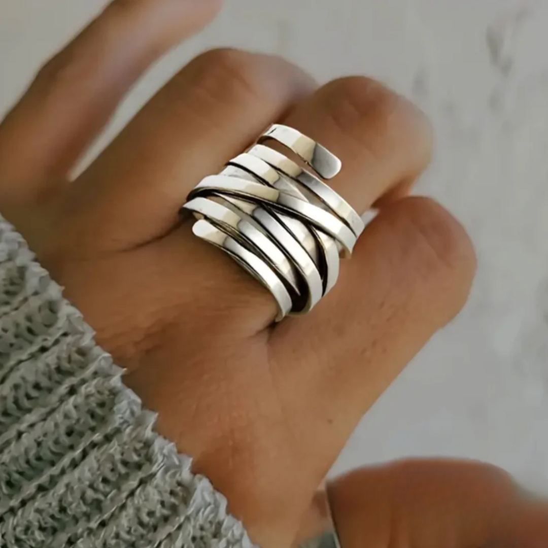 Ein kunstvoll geschwungener Ring, der Dynamik und Eleganz in sich vereint. Ideal für Frauen, die starke Akzente setzen möchten – tagsüber wie abends.