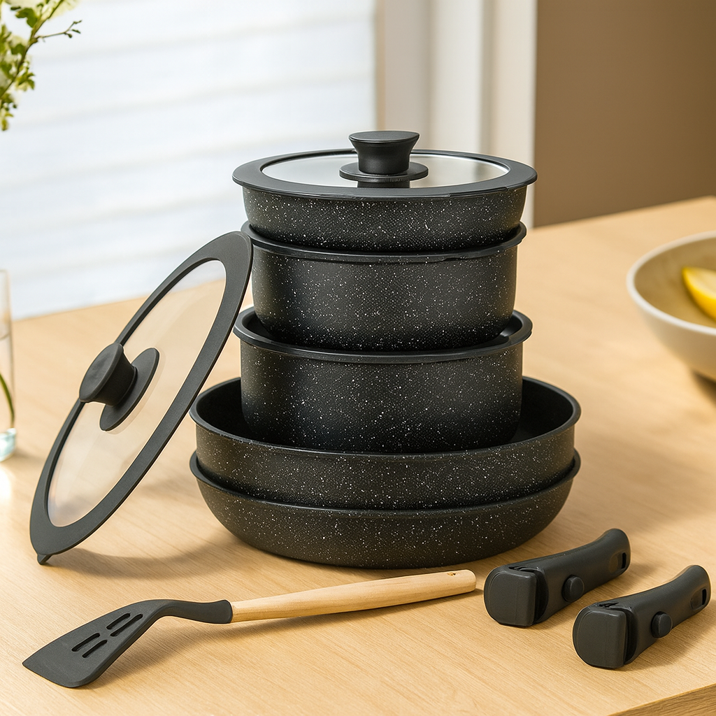 - Abnehmbarer Griff – Lässt sich leicht stapeln, aufbewahren und vom Herd bis zum Backofen verwenden.