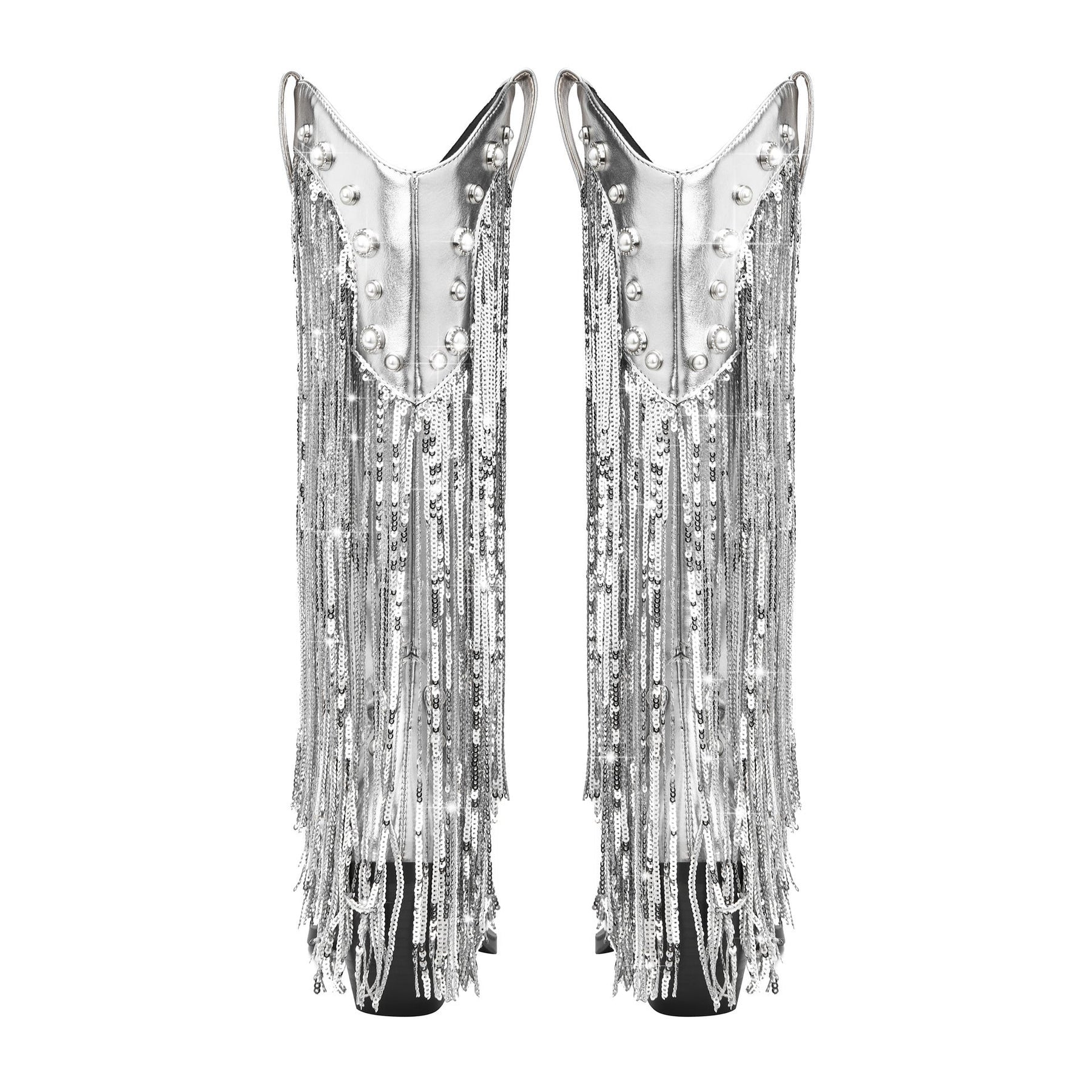 Verleihen Sie Ihrer Garderobe mit diesen Bold & Boho Cowboystiefeln für Damen einen ausdrucksstarken Touch – Western-Wurzeln treffen auf Bohème-Flair. Mit schimmernden Metallic-Tönen, fließenden Fransen und luxuriösen Verzierungen ziehen diese Stiefel überall die Blicke auf sich. Ob beim Tanzen auf einem Festival oder beim Aufpeppen eines lässigen Looks – sie verleihen jeder Bewegung Persönlichkeit, Power und Eleganz.