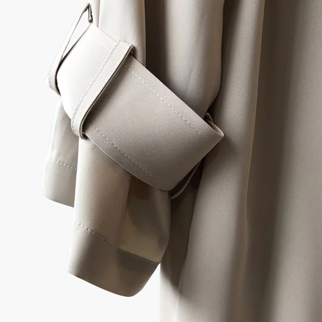 Dieser lange Damenmantel verfügt über einen Reverskragen, der in eine doppelte Vorderseite übergeht. Die langen Ärmel sind mit verstellbaren Gürteln am Ärmelabschluss versehen. Der Mantel hat zwei Seitentaschen und endet mit einem geraden Saum, was eine schlanke und strukturierte Silhouette ergibt, die für Übergangszeiten geeignet ist.