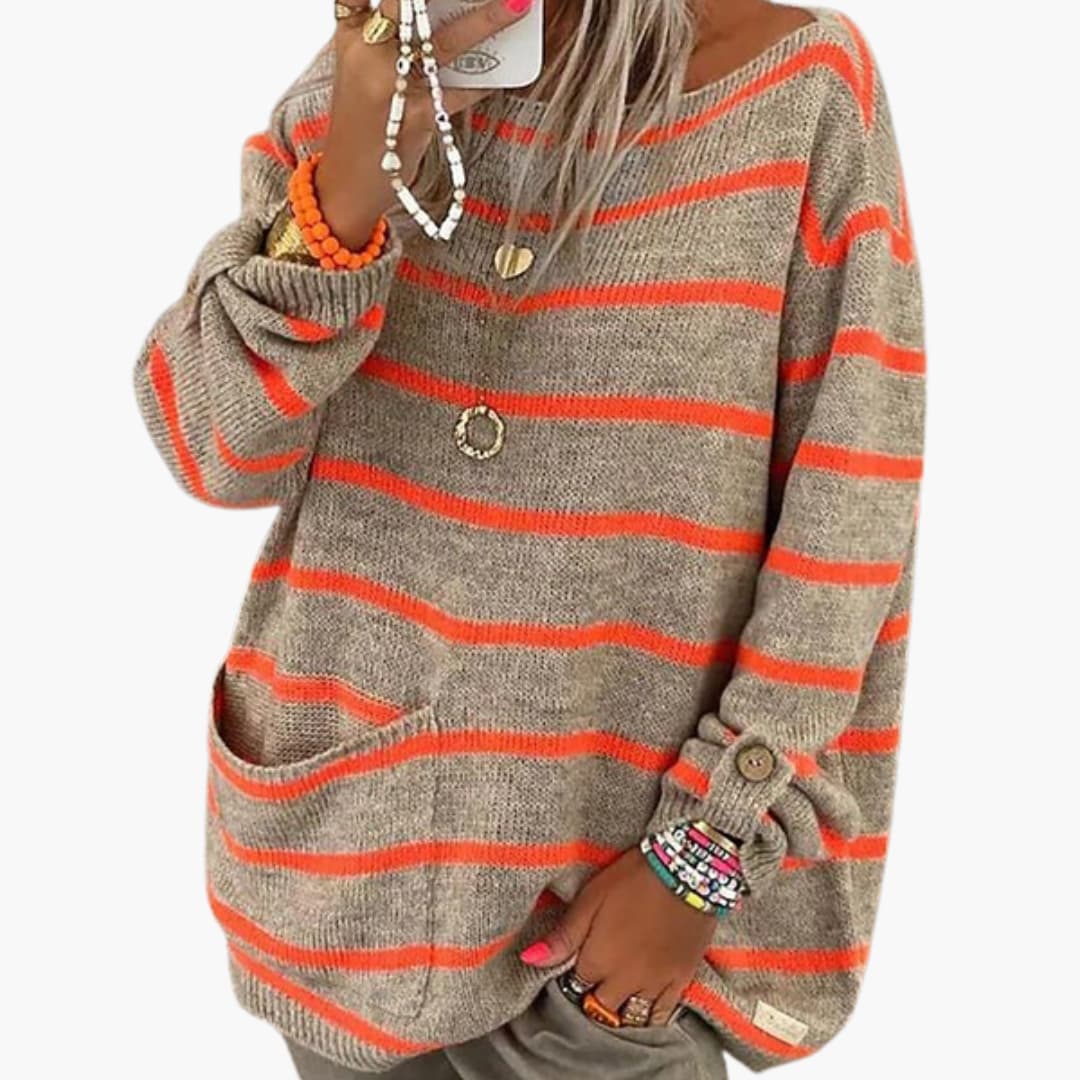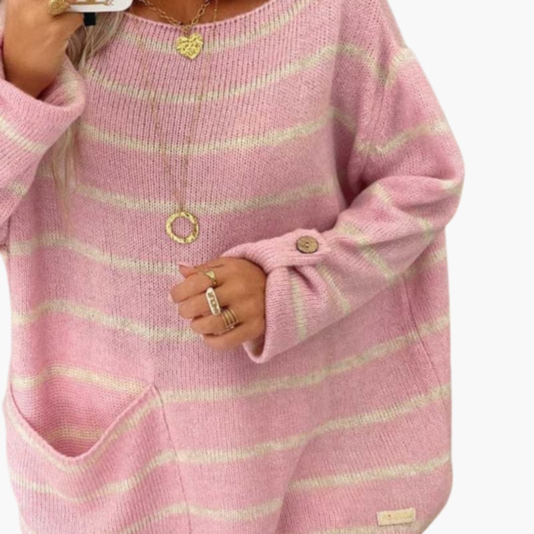 Gestreifter Damen-Strickpullover mit U-Boot-Ausschnitt und Fronttasche.