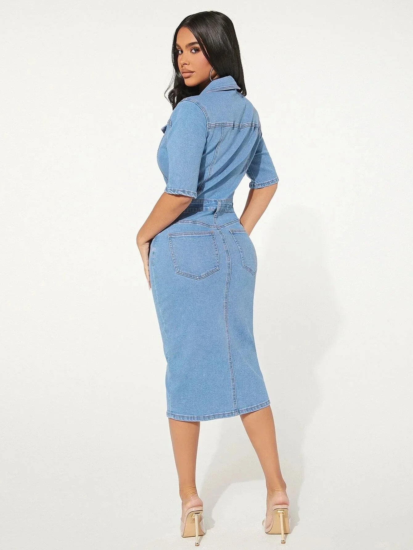 Das aus hochwertigem Denim gefertigte Kleid bietet eine schmeichelhafte Silhouette, die alle Körpertypen ergänzt. Der raffinierte Schnitt und die durchdachten Details sorgen dafür, dass Sie bei jeder Gelegenheit glänzend und schick aussehen. Kombinieren Sie es mit Ihren Lieblingsschuhen für einen gehobenen Look oder für einen entspannten Look mit flachen Schuhen.
