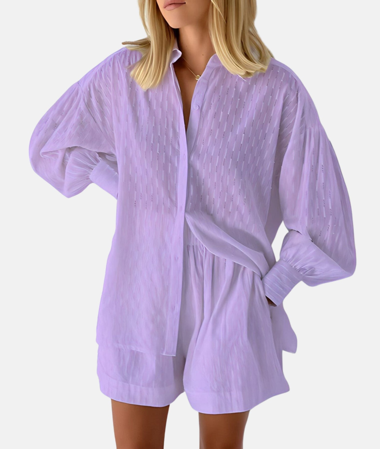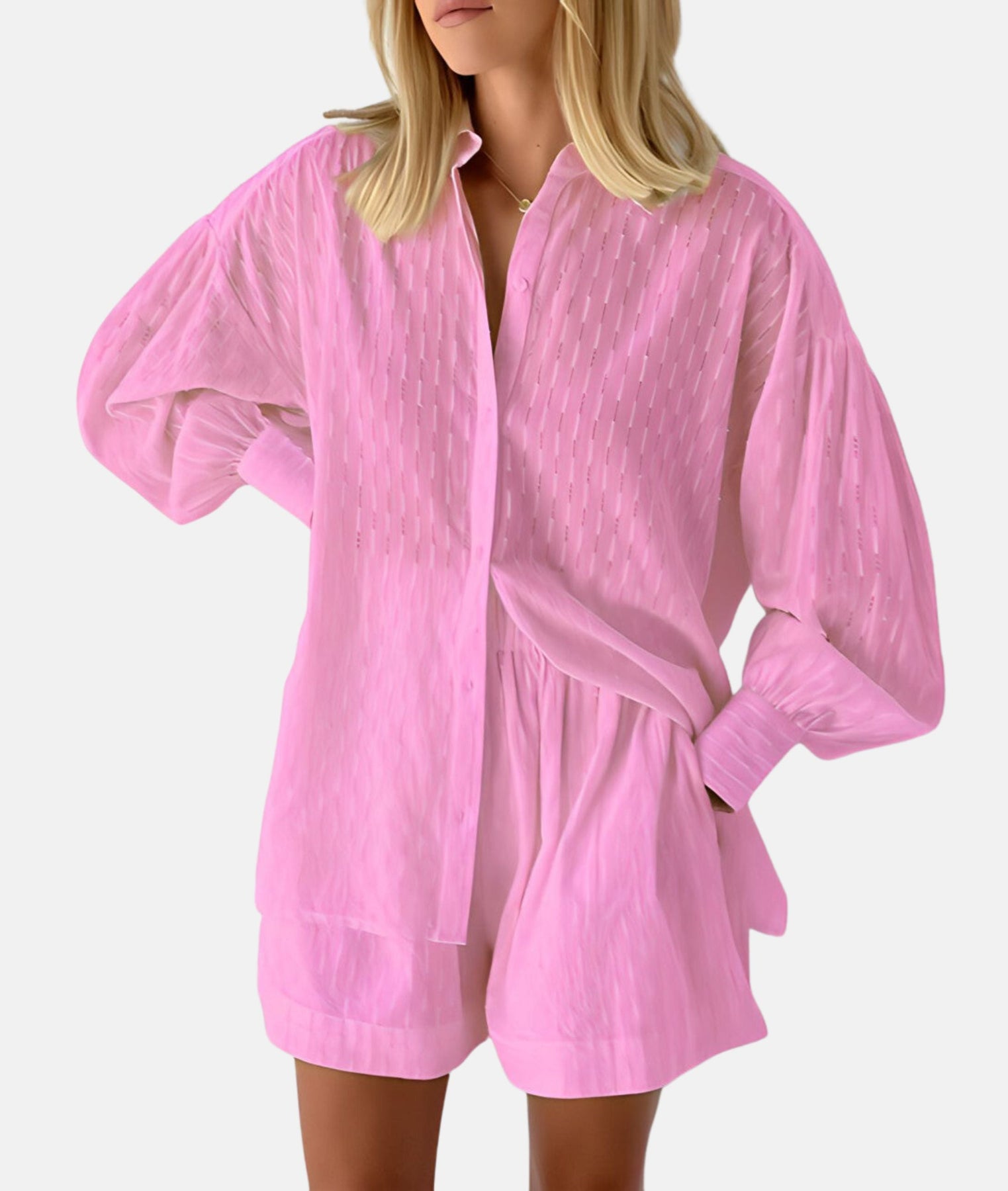 Entscheiden Sie sich für Komfort, Stil und Vielseitigkeit mit unserem wunderschönen Set für Frauen, bestehend aus Shorts und einem langen Shirt mit übergroßen Ärmeln. Vervollständigen Sie Ihre Garderobe mit diesem zeitlosen Set und lassen Sie sich überall sehen.