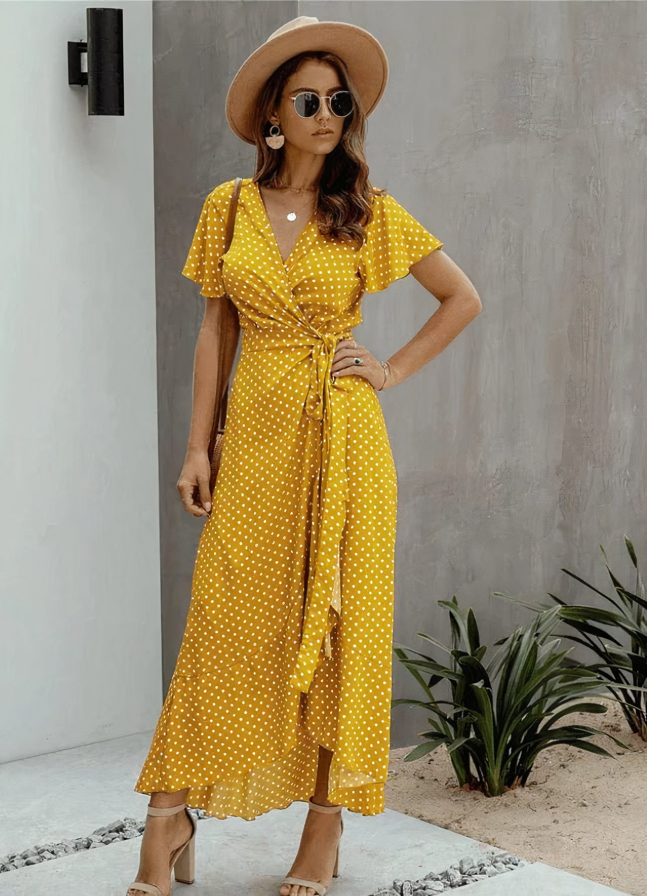 Bringen Sie frischen Wind in Ihre Garderobe mit dem gelben gepunkteten Midikleid -Astria. Dieses fröhliche Kleid ist mit verspielten Polka-Dots verziert und verleiht Ihrem Stil einen lustigen Vintage-Touch. Die leuchtende gelbe Farbe ist perfekt für warmes Wetter und macht es zu einer idealen Wahl für Sommerausflüge und zwanglose Treffen.