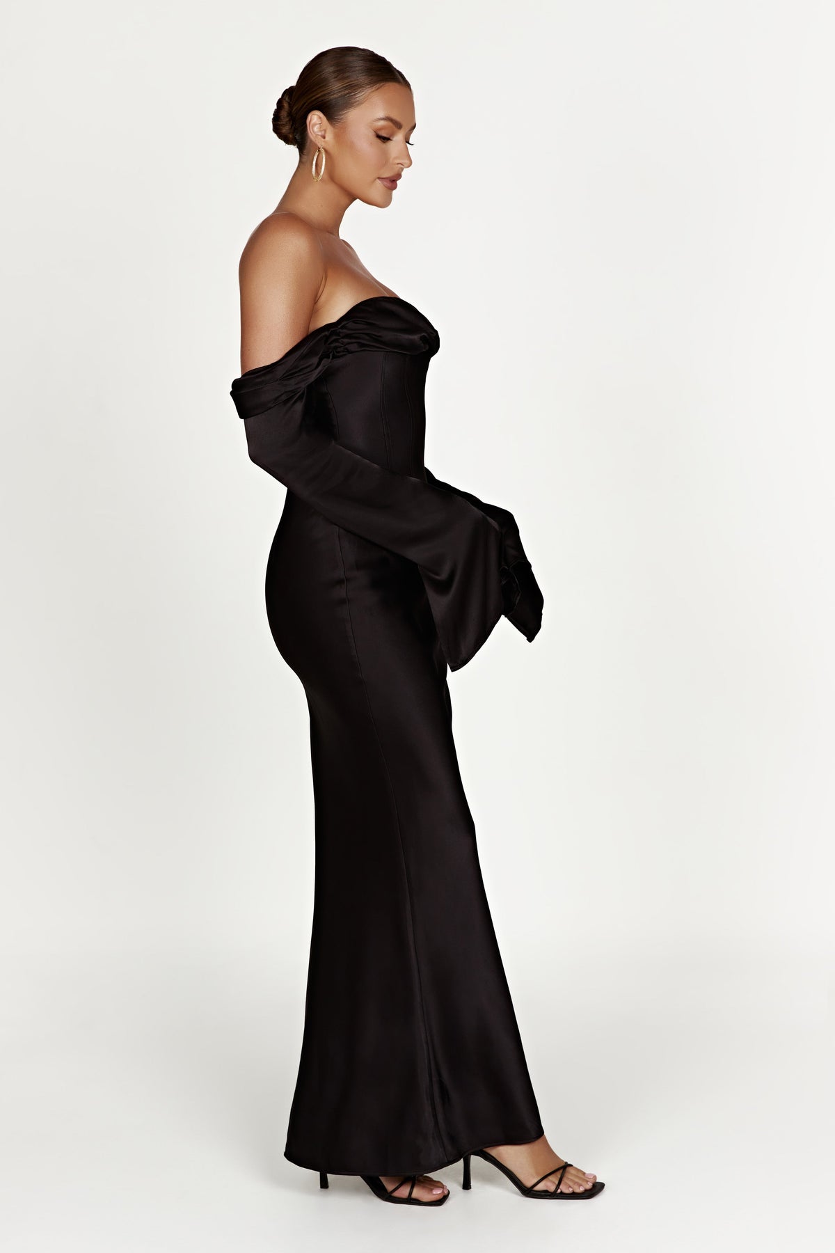 Das schulterfreie Maxikleid GISELLA ist wie ein wahrgewordenes Märchen. Dieses Kleid strahlt Dramatik und Romantik aus, mit einem gedrehten Viskosestoff, einem schulterfreien Ausschnitt, ausgestellten Ärmeln mit geschlitzten Manschetten und einem Seitenschlitz. Perfekt für formelle Anlässe bietet es Komfort und Eleganz zugleich. Das Kleid kreiert einen bezaubernden Look, ideal für Abendpartys und romantische Verabredungen.