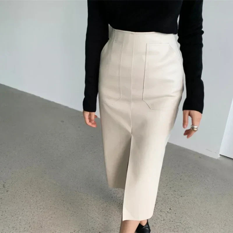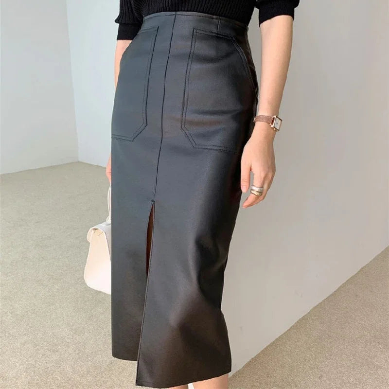 Deze exclusieve rok van hoogwaardig imitatieleer heeft een perfecte pasvorm en voelt comfortabel aan. Met zijn monochrome stijl, praktische zakken en elegante split aan de voorkant met ritssluiting creëert deze rok stijlvolle highlights en voegt hij een vleugje verfijning toe aan elke look.