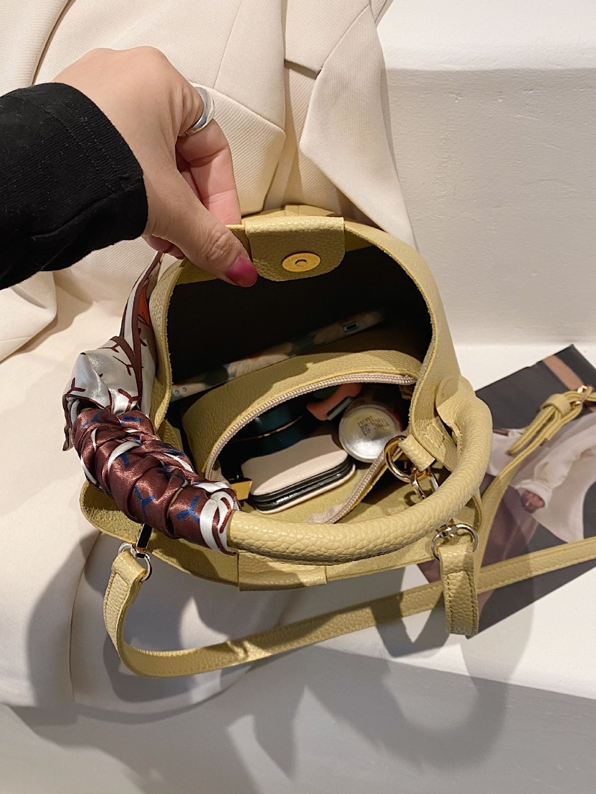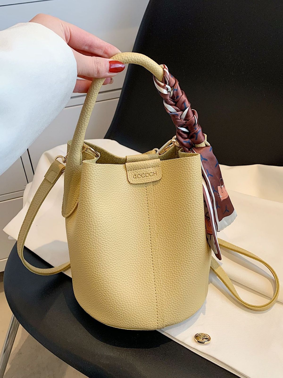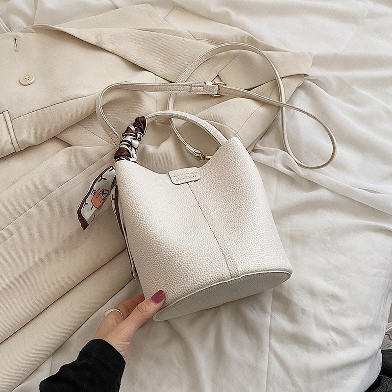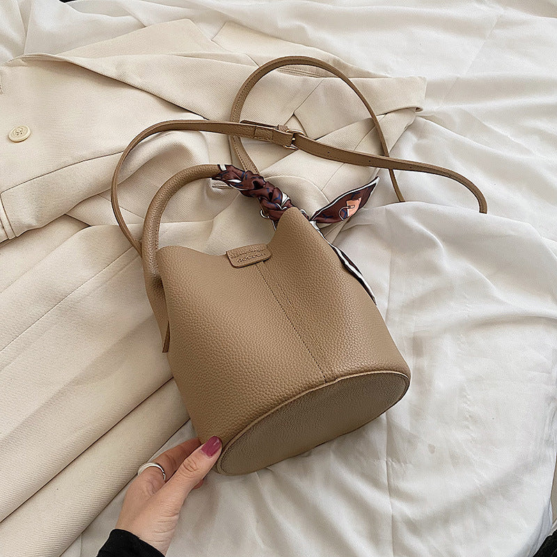 Moderne Bucket-Bag im minimalistischen Design – kompakt und dennoch geräumig. Das dekorative Seidentuch verleiht der Tasche eine feminine Note und macht sie zum idealen Begleiter für Alltag, City-Trips und elegante Anlässe.