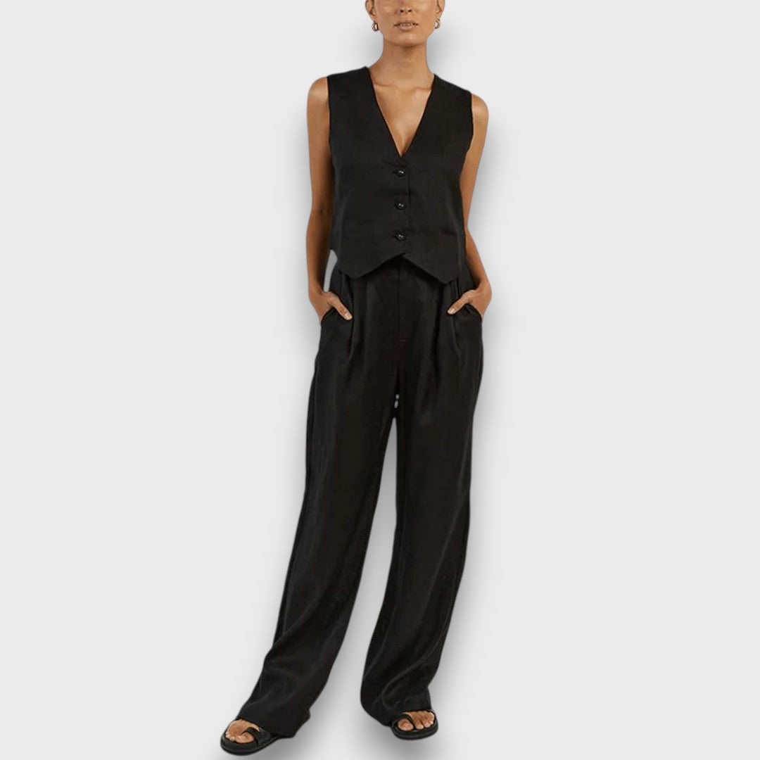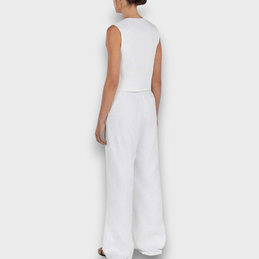 Perfektes Sommerduo – ärmellose Weste trifft auf High-Waist-Hose mit weitem Schnitt