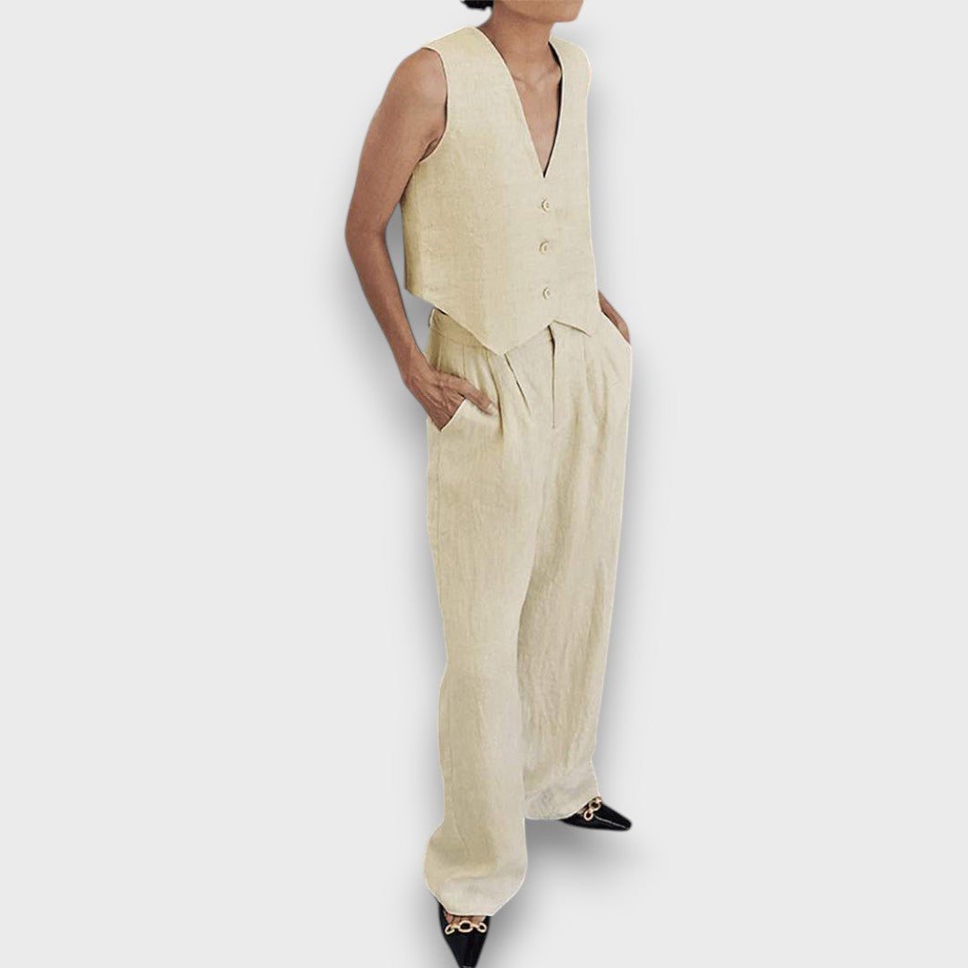Solenne vereint die rohe Eleganz von Leinen mit einer raffinierten, sommerlichen Form. Die ärmellose Weste und die High-Waist-Hose mit weitem Bein schaffen eine Silhouette, die zugleich entspannt und stilvoll wirkt. Der tiefe Ausschnitt bringt Leichtigkeit ins Spiel, während jeder Schritt in diesem Look wie fließende Bewegung erscheint – natürlich, kraftvoll, mühelos.