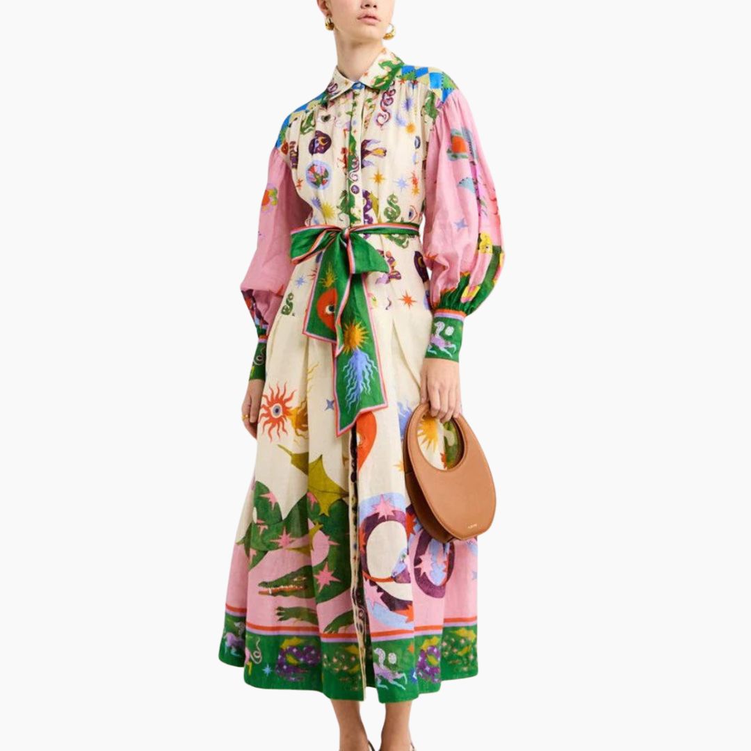 Die lebendigen Muster und die elegante Silhouette machen dieses Maxikleid zu einem wahren Blickfang. Die feine Baumwolle sorgt nicht nur für hohen Komfort, sondern unterstreicht auch die natürliche Schönheit des Schnitts. Perfekt als festliches Kleid für besondere Sommermomente oder elegante Feiern unter freiem Himmel.